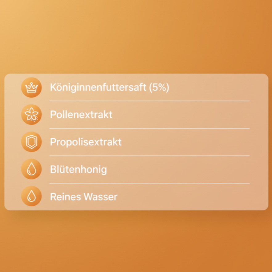 Swiss-made, GMP/ISO certified, 100% natural – 3000 mg honey, 500 mg royal jelly (5%), pollen + propolis. No additives.